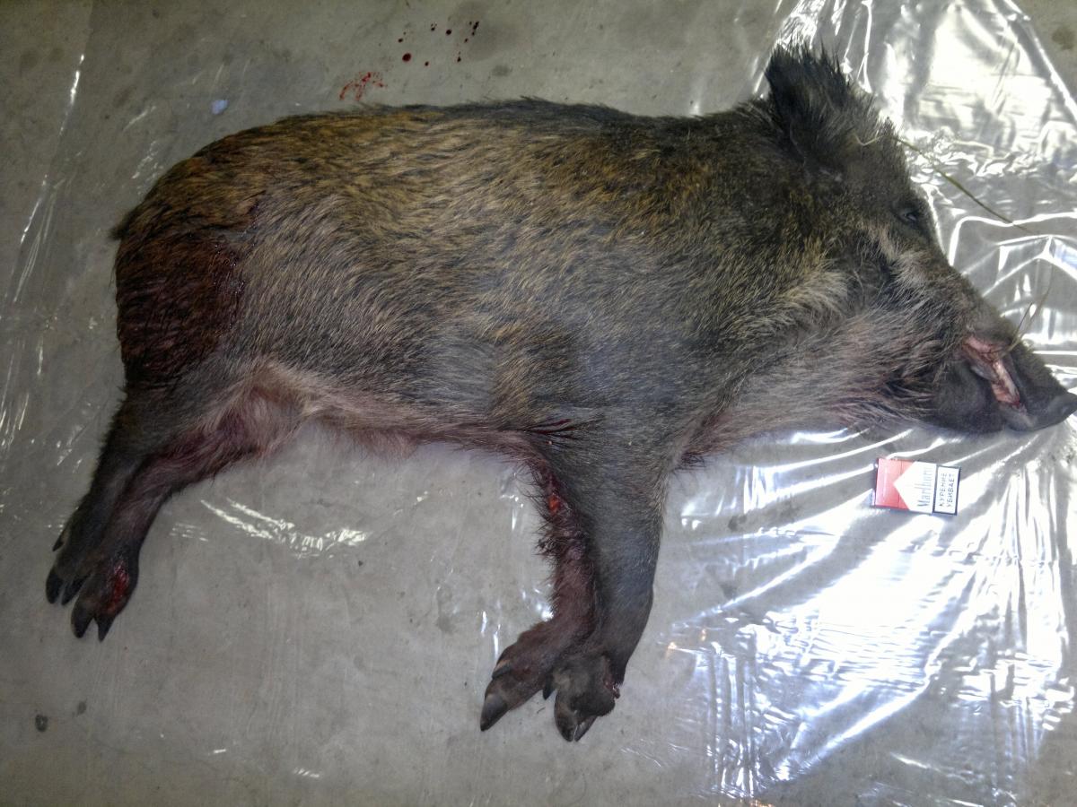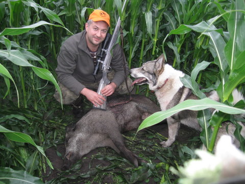 прекрасная погодка солнышко светит, легкий морозец, листва не совсем еще опала, но лес уже просветлел. Слышу лайка-сучка соседская заверещала, да злобно так с подскуливанием, явно на кабана лает и на одном месте. Не торопясь ловлю встречный ветерок, сокращаю дистанцию метров до 50. Вхожу в старую заросшую вырубку, видимость максимум 10 метров. К работающей суке присоединяются ещё три лайки, подошел к ним на метров 20, вижу мелькающих в кустах собак, запах секача, вот и он показался рычит на собак хотя и не атакует - видать спокойный пофигиист, хоть и не сильно большой примерно кил 90 , но уже с лоснящейся серебристой сединой. Стрелять естественно не могу кусты явно не пробью, млять нах я пулями зарядился ведь всегда ж в загоне в один ствол пуля, в другой картечь самодельная 10 милиметровка приплющенная по старинному рецепту, ей бы вдарил как этот седомудый от собак чуть рывок сделает. Кабан чуть двигается вперед, пытаюсь выловить момент когда он попадет в прогал, ан нет видимо молодой кобель изловчился да и хватанул секачка за жопу. Тот с визгом не привычно фальцетным для кабана такого размера, выпрыгивает на меня в штык, целится некогда (это печать и читать долго а в реальности какие то доли секунды