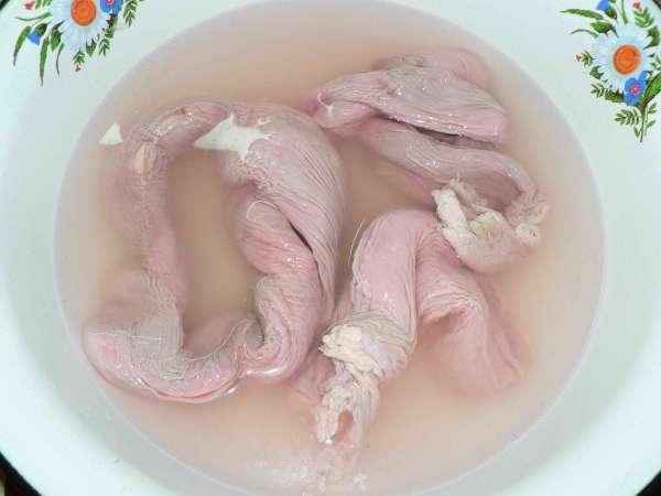 Вырезали, выдавили котяшки, потом выворачивается наизнанку, скоблится, моется, скоблится, моется И можно сразу тушить-жарить с прочими потрошками.