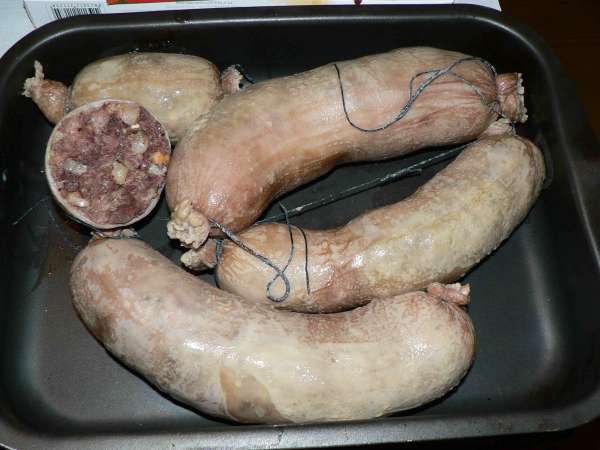 Да, технология требует быть не брезгливым...Кишки моются холодной водою, выворачиваются, скоблятся ножом пока не удалится слой до нужной толщины, потом лежат в соли , а бабушка готовит жир,сало, кровь, ливер, мясцо, гречневую крупу и прочее и прочее.........Все это наливается в кишку, перевязывается, укладывается на противни , заливается жиром и в русскую печь! ( можно и в духовом шкафу)..