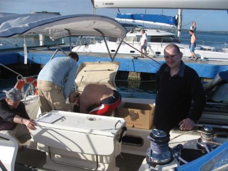 Через пару дней пьянства в марине Кайо-Ларго большинством было принято решение «идти на грозу» и мы все снялись и на ночь глядя отчалили в сторону кубы. Штормило слегка, меня (кока) на три минуты поставили на штурвал – пока остальные побежали парус править после галса – и я сорвал привод штурвала….. Короче мы неуправляемы в открытом море…… ночь…. Очень страшно! Автопилотом и оставшимся и очень люфтившим штурвалом, используя прием «коровий фордевинд» мы таки пришли в порт приписки, однако сделав крюк где то миль 80. Штурман сильно ругался и требовал, чтобы мы вернулись в карту – ато он нам точку дать не может J. Как ни странно – меня за борт не сбросили. Благодаря самоотверженности капитана и остальных членов команды, яхту на дно мне пустить не удалось. Кстати в тот шторм у одной из баварий оторвало ахтерштак – и они чуть мачту не потеряли…. Доползали на дизеле. А катамаран пришел без грота, который оторвало от креплений к мачте….