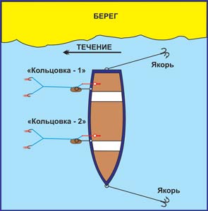 Возьмем для теоретического эксперимента реку Матросовку. Учитывая приличное течение, ставим лодку на носовой и кормовой якоря (рис. №3). Два якоря это необходимое условие для данного вида ловли на течении. Прикормка (каша, хлеб, жмых и так далее) укладывается в мелко ячеечную сетку.