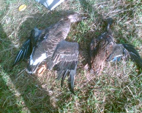 Часа в 3 решили пообедать - над водой пролетел и сел у полуострова одинокий лапчатый. Решили скрасть. С братом подошли с двух сторон в пределах видимости друг друга, начали сходиться, он уже у края воды в том месте, где приводнился лапчатый. Начинаю обходить его справа. Из травы поднимается кряква, секунду на обдумывание ситуации (гусь не отплыл - иначе увидели бы, значит сидит под берегом, крякву можно бить), первым (единица на гуся) мажу, вторым (тоже единица) достаю, пуху как из пропоротой подушки. Перезарядка, три шага вперед и два выстрела брата - еще три шага, я у кромки камыша и в 15 м от берега лежит лапчатый. Пора искать крякву. Ветер к берегу, но гусак зацепился за кувшинку и никак не хочет к нам плыть. Иду за лодкой, отец и брат ищут утку. Поиски в итоге заняли полчаса, когда подплыл с трофеем на лодке, в камышах раздался выстрел в воду. Крякуша оказалась очень стойкой на рану - при попадании 6 дробин по корпусу у правой лапы под хвост, с пробитой в 2-х местах печенкой (желчь не задета) и перебитым крылом она еще умудрялась полчаса подныривать так, что видно было только полголовы. По возвращению к машине продолжили обед, на кровях, объехали пару луж, но пусто, в 6 вечера сели в засидки. Вечер был тихий и спокойный - налетел один чирок, который был взят братом с подъема. Гусей протянул один косяк голов 150.