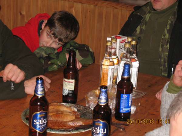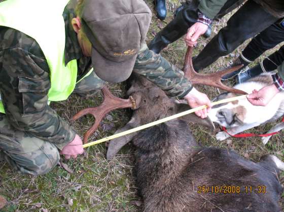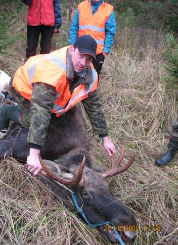 Вследующем загоне должны были быть кабаны. Когда шли на номер видели множество свежих следов жизнедеятельности кабанов и лосей. Рассматривая эти вдруг слышали треск веток и наш сегодняшный герой увидел лосей, тут он пробежал стометровку, лосиха была быстрее и ушла а бычок вышел на вырубку и попал под беглый огонь, первая пуля прошила ухо, вторая попала в лопатку, тут лось повернул другой бок и получил туда еще одну пулю, лег через 10-15 м. … всетаки загон решили сделать и в конце загона на вырубку вышла еще одна лосиха, но очень далеко и наконец-то он промазал ... зларадость самая большая радость. В Последний загон сказали надо ему идти загонщиком, хватить уже... А мне самому в этом сезоне ни одного выстрела ... один раз правда был кабан, но видел слишком поздно и по ТБ не стал стрелять ... Ели-eли моя нивушка могла вытащить лося с края вырубки.