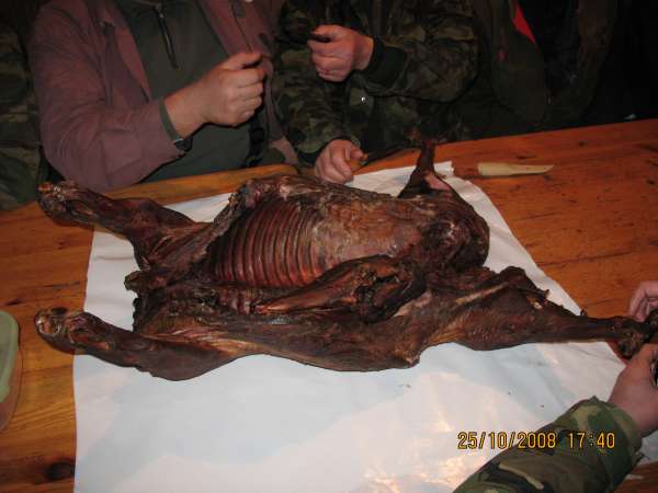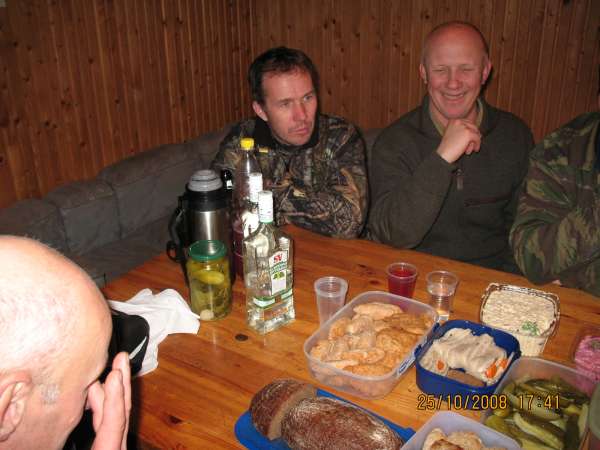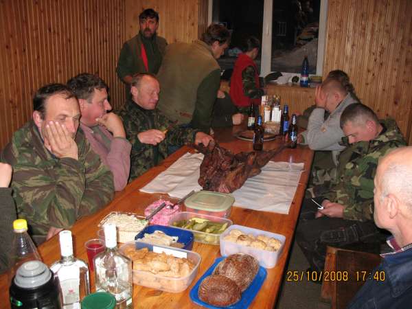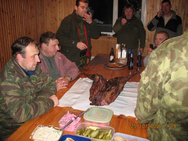 Потом ошкуривание и разделка мяса, повесили на крючки остудится. Ну и потом посиделки, копченый поросенок, добыча прошлых выходных на столе, фотки с той стадии когда все еще аккуратно, в т.ч. и охотники. Sorry, на охоте снимать некогда, фотик в машине лежит.