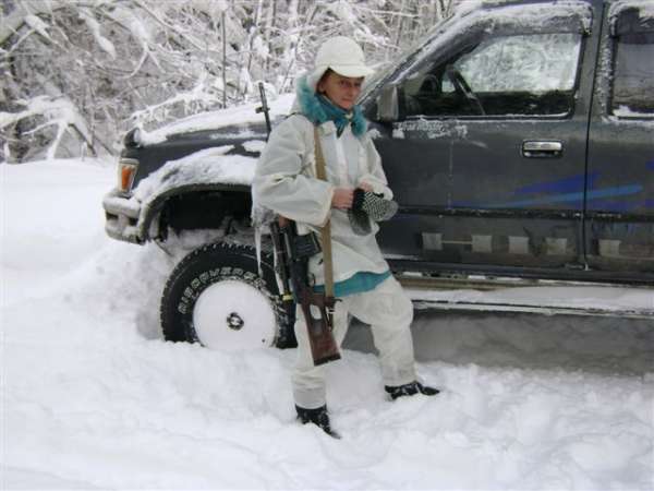 Маскировочные средства. Есть практичные западногерманские белые маскировочные костюмы. Это свободные белые куртки и брюки, надеваемые поверх наших "нестандартных", но теплых зимних комбинезонов. Обшитые лоскутами материи, они дают хороший маскировочный эффект. Я обхожусь самодельным, пошитым из синтетики для изготовления парусов. Имеющиеся в продаже ХБ или из длинноволокнистой синтетики - не практичны. Рвутся и плохо стираются. Их хватает обычно не более, чем на сезон.
