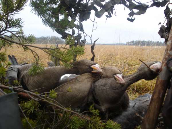 а вот уже и моё счастье налетает справа, подманиваю одиночным гоготанием, летят прямо на профиля метров 15 от земли. единственный вопрос мучает когда стрелять, сколько ещё ждать , но гуси решают этот вопрос за меня подлетев метров на двадцать. ждать дальше не стал, вскакиваю и после первого выстрела вижу левым глазом как один камнем падает вниз, а в это время правый глаз уже выцеливает следующего гусика, выстрел и уже не смотря попал или нет произвожу остальные три . почти уверен что два есть. жду когда не будет слышно гусей. что бы не портить охоту товарищам, минут через двадцать выхожу из засидки и буквально через метров шесть нахожу первого, ещё три шага второй , на всякий случай ещё пару шагов и ........... о чудо третий лежит, все были биты чисто что порадовало(на предыдущих охотах были только подранки которых приходилось добирать) рожа светиться от счастья. вот оно. единственное что омрачает . что супруга ещё без добычи.