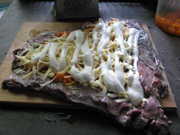 Два рулета из лярников(пашина,брюшина) фаршированые сыром грибами и майонезом.