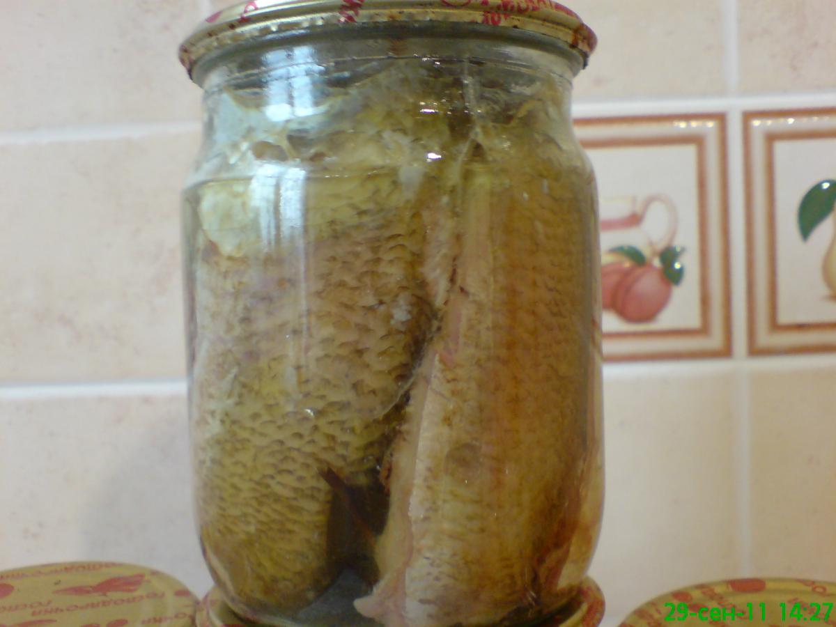 Добавляем по пол чайной ложки крупной соли в каждую банку ( я просто солю рыбу, как для жарки. Вообще рыбу лучше слегка не досолить). Добавляем столовую ложку рафинированного масла. Раньше вливал две, но одна лучше! Закатываем банки. ( на фото консервы приготовленные к варке).