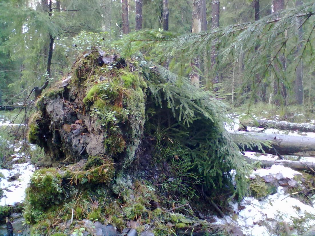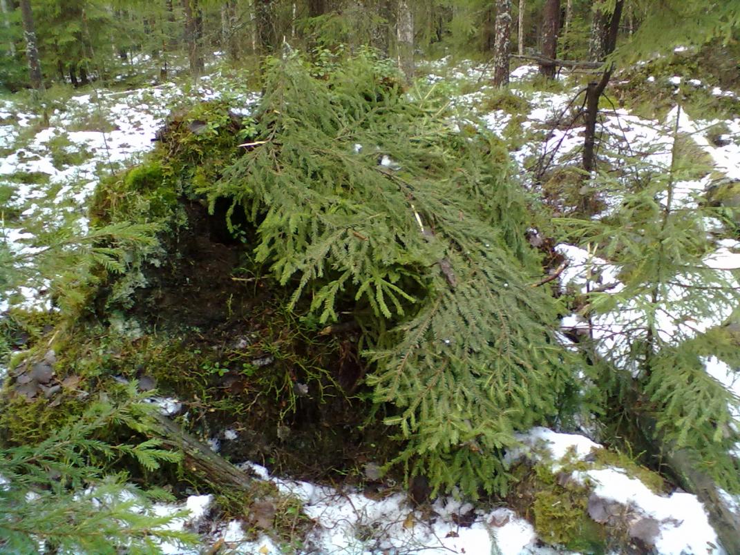 Оно того не стоит. Тогда уж лучше подождать снега и соорудить из него, что душе угодно, хоть на земле (холмик с полой серединой), хоть на том же выворотне. Из палок что угодно сложить можно, завалив лапником и снегом, благо форма у выворотней удобная.Можно ведь и ручным инструментом...
