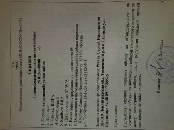 Алексей,по докам два сомнения.Это нет №клейма,без него не получишь родословную РКФ, нет № вязки.Фамилии Яковлева и Лаврова настоящие. Попробуй свяжись с Нач охототдела военохотобщества Васильевым Александром Михайловичем,ему там подчиняется собаководство. То что нет номеров может быть просто разгельдяйство его там хватает.