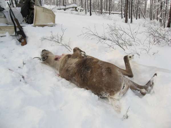 Вернувшись на место вчерашней гонки, распутав все следы, с удивлением обнаружил, что олени опять объединились и след идёт на северную сторону сопки с хорошими прострелами. Если не уйдут на заросшую молодняком вершину – можно и поохотиться! Путик есть, видимость нормальная, еду по путику, держа в поле зрения олений след и поглядывая по сторонам. Через 3км замелькали четыре задницы. Бегут вдоль путика метров 600-700 впереди. Ну тут уж хрен угадали! По путику от бурана не уйти! Подлетаю метров на 200, глушу, глазами выискиваю прогалы для стрельбы, стаскиваю из за спины вепрюгу, олени в это время перескакивают через путик, вскидываю… Блин, не успеваю поймать на мушку! Уходят!!! Завожусь, еду по следу. Надежда тает, по целику да в верх по склону буран идёт кое как. Орентируясь по следам, вижу, что прут в сопку, пытаясь обрезать, лезу туда, буран натужно ревёт, нагребает снега аж до лобового стекла, но лезет. След повернул вниз, к ключу, поворачиваю, обрезая. Вот они! Мелькают меж деревьев метров 300-350, внизу чисто! Ушлые рогатики разворачиваются и уходят в сопку. Уйдут туда – пипец! Глушу, вскидываю карабай, целиться хреновато, бегут быстро, деревья, кусты, да и в снегу по брюхо олешки. Бегут перпендикулярно мне в сопку, двинул планку на 3, веду на мушке головную матку, вот она в прогале, хлесть! Бегут! Так стреляю ещё 3 раза. Убежали. Завожусь, за ними! Олени уже залетели в Чепуру на вершине, один только вдруг повернул в низ, но увидев меня сразу одумался и рванул за остальными. Всё! Ушли! Тут взлетает глухарь и садится метрах в 60 на лиственницу, что ж, на безрыбье и рак рыба, перезаряжаюсь на оболочку – снял. Подъехал, поднял – грудину разворотило напрочь! Пулю видать крутнуло через ветки. Расстроившись ушедшим оленям и испорченному петуху, вдруг осознаю, что в чепурень заскочило ТРИ оленя! Где ещё один? Возвращаюсь по следам обратно – нате, лежит та самая головная матка с дыркой аккурат посередь шеи. В горячке и не заметил, как она рухнула на ходу, да и как заметить, когда они мелькают меж деревьев, как мыши!