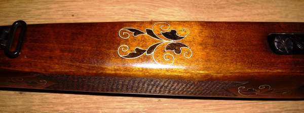 6. Дерево покрыто лаком, а под ним вдобавок <хохлома>. Я не сторонник таких украшений. Во всяком случае, пока. Ручёнки будут потеть, скользить, а лак придет в негодность рано или поздно, тк сцуко хрупкий. Имеется непроверенная информация, что светлая часть узора - серебряный профиль, который уходит в дерево примерно на 1 мм. Есть ли у кого-нибудь опыт? Лечил ли кто-нибудь подобное?