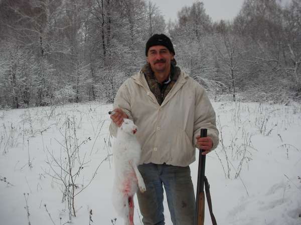 Утро, легкий морозец, вчера прошел снег. Мы с Борисом выезжаем в угодья. Проехали с километр, вот и следок. Выходим. В лесу создается впечатление, что зайцы ночью не только ели но и пили и еще танцевали. Набегано ужасно. Находим самый свежий след, идем по нему. Паралельно идут еще пара следов. Через часок Боря поднимает косого. Я на лежке, Борис по следу с голосом. Голос удаляется и в конце концов пропадает. Запрашиваю по рации - заяц прет по прямой и не сворачивает. Боря закусился прет за ним. Минут через 40 Боря передает, что заяц завернул и идет в мою сторону правда далеко. Ноги в руки, на перерез. Прикинул место, встал. Но тут рация сыграла с нами злую шутку. Боря начал корректировать мое местоположение. Косой рацию услышал и метрах в 40-ка ушел мимо меня редколесьем. Короче гоняли мы его еще пару часов но заяц оказался профессором. Из леса вышли - ни рукой ни ногой.