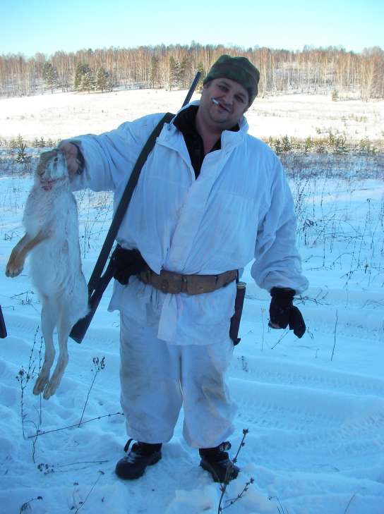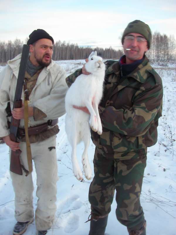 Прошел Новый год. Маленько спали морозы. Утро. Мы с Борей поехали посмотреть следочки. Есть заход в наш фирменный загончик. Обрезаем - отлично! Заяц сидит в небольшом ельнике. Едем за ружьями и еще одним товарищем. Возвращаемся, встаем на номера. Я стою метрах в 50-ти от входного следа, Боря в загон по следу, голоса не подает еще не дошел до лежки. Минут через пять накатывает мысль. Надо бы перебежать поближе к следу, поворачиваю голову, а косой уже бежит через поляну по своей тропе. Стреляю, вроде чуть зацепил, но заяц уходит в овраг. Боря идет по следу, я начинаю обрезать, вдруг из рации удивленный голос Бориса "или я совсем идиот, или мы нарвались на норного зайца". Выясняется след доходит до огромного камня и уходит в лаз. Боря обрезает, но выходных следов нет. Дальше как в анекдоте. Боря ставит ружье к дереву, отламывает палку, и тыкает в лаз. Заяц вылетает с другой стороны камня и пока Боря хватает ружье уходит на приличное расстояние. Два выстрела. Я вижу через овраг (метров 200) очень тяжело бегущего зайца, но опять вмешалось число 13. С выстрелом поднялся еще один заяц и пошел в ту же сторону. Боря благополучно перешел на гонный след и и результатом дня стала невыносимая боль в ногах. Кто по горам и долам по снегу ходил тот поймет.