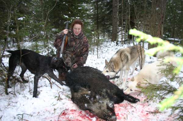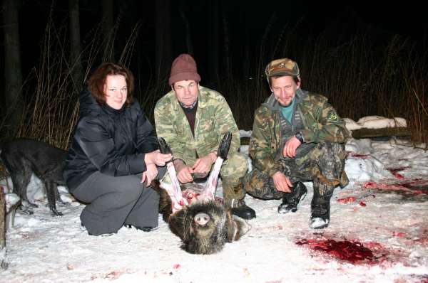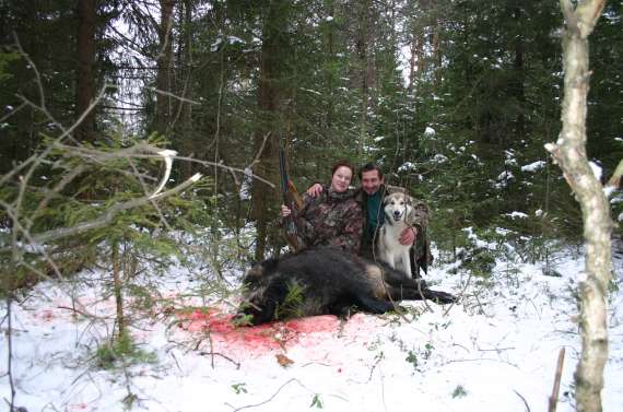 хи..хи.. но все благополучно! метров 600 мы выволакивали свинку.. собаки обиделись ,что мы утаскиваем их добычу и потому пытались ехать на свинье, утяжеляя нашу работу! Нам несказанно повезло, подъехала буханка с егерем! Все-таки УАЗ в сочетании с бензопилой может пройти по любому направлениюЯ очень рада, что эта сказка закончилась хорошо! собаки заработали! Я попринимала личное участие в процессе! И, ГЛАВНОЕ, свинка больше не мучалась! Жаль только, что время вышло.. охота на копыта закрыта!