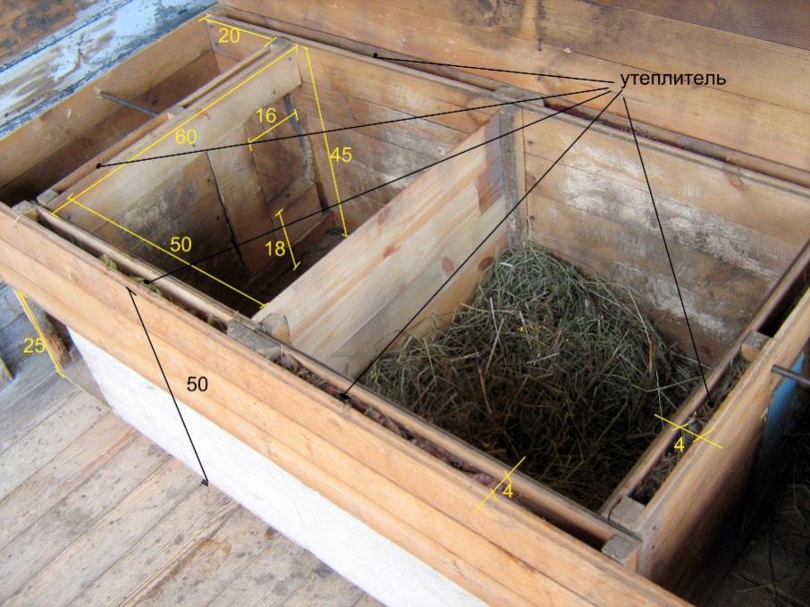 Чем сложнее конструкция будки, тем лучшие условия создаются и для паразитов. Поэтому к выбору утепляющих материалов надо подходить очень внимательно. Идеальным вариантом является монтажная пена, не впитывающая влагу (не гниет, не будет паразитов, нет вредных выделений, исключительная теплоизоляция). Одно «но»: при ее использовании предъявляются повышенные требования к прочности стенок – у меня на первой будке их «расперло» (тонкие незагнутые гвозди просто вытянуло). Очень хорошо подходит для этой цели листовой пенопласт.