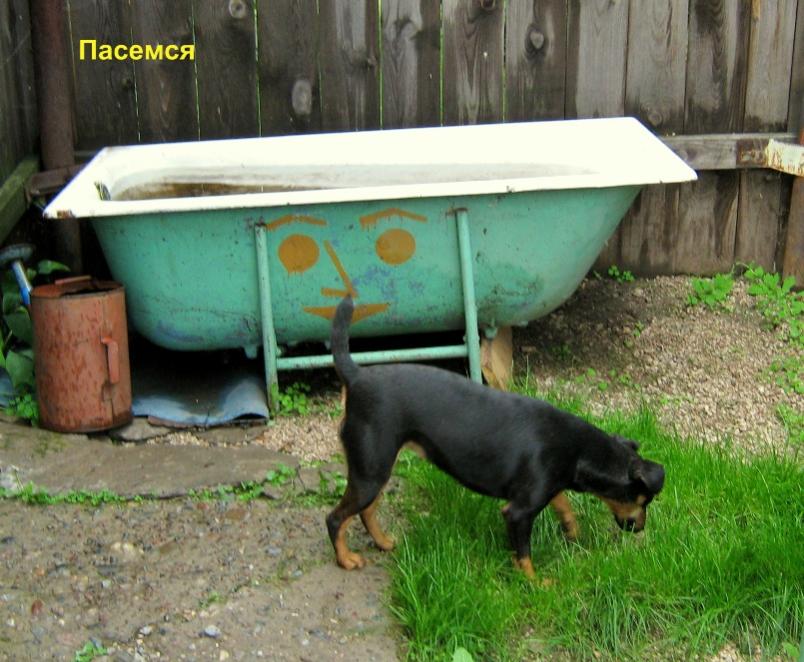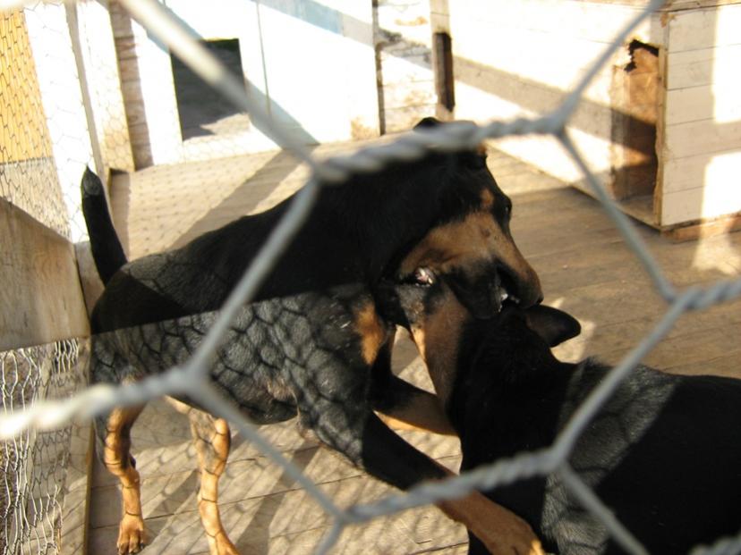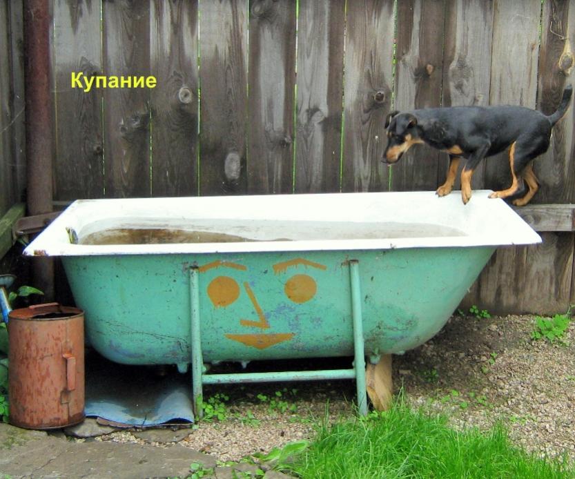 В отличие от человека, у собак не происходит потообразования и потоотделения для снижения температуры тела посредством испарения влаги с его поверхности (лишь немного через подушечки лап и ушные раковины). Теплоотдача у этих животных осуществляется за счет учащенного дыхания, в результате чего возрастает испарение влаги через органы дыхания. В знойные дни с высокой влажностью этого недостаточно, и для помощи собакам мы поставили в прогулочном дворике под водосток с крыши старую чугунную ванну. Оттуда же берем воду для полива насаждений – так что вода регулярно освежается (если нет дождей, то из домашнего водопровода). Ежедневные купания доставляют собакам массу удовольствия, они сами наперегонки лезут в ванну. Под этой же ванной, как в норе, устраивают «гладиаторские» бои между собой. К потолку вольера к веревке на жестких пружинах подвешиваются для тренировок прыгучести и укрепления мышц шеи и челюстей «игрушки» (резиновые кольца, покрышки от детских велосипедов и т.п.). Но в отсутствии хозяев проводить эти занятия нежелательно, чтобы не потеряли интерес и не передрались между собой.