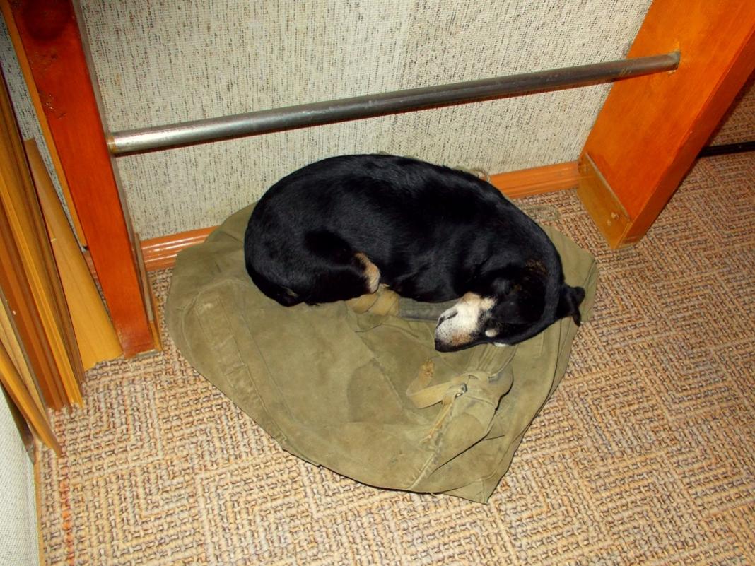 Но так как я большую часть в разъездах, то пес спит где придется. Бывает у костра, бывает в доме вместе со мной (если нет огороженного участка).
