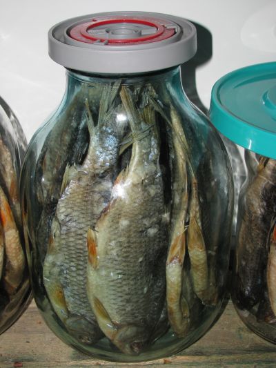 Храню ее в мешках из х/б ткани в гараже, подвешиваю на проволоке к потолку, мало ли крыс какой объявится. Поскольку в гараже всегда влажность больше, рыба долго не пересыхает. На зиму складываю в трехлитровые банки. Но чаще сестра из Рязани приезжает, и увозит то, что не съела здесь.