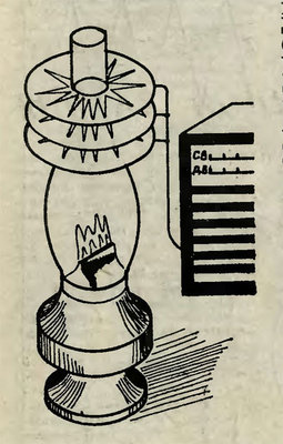 Для изготовления батареи потребуются два куска проволоки (стальной и константан свой) диаметром 1,3 мм, длиной 18 м каждый. Концы каждого элемента зачищают и скручивают вместе, затем сваривают. Элементы крепят на асбоцементной панели (рис. 1). При проверке отдельные термопары должны давать ток около 22 мА от нагревания спичкой и около 30 мА при нагревании спиртовой горелкой. При нормальном горении спиртовки батарея даст 1,5 В при токе 0,3 А (рис. 2). Изготовив набор таких батарей и соединив их параллельно, можно получить постоянный электрический ток мощностью, достаточной для’ питания транзисторного приемника и схожих электроприборов. Надо лишь помнить о том, что при последовательном подключении растет внутреннее сопротивление батареи.