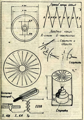 При подборе материалов удобно пользоваться таблицей, приведенной ниже. Лучше выбрать те из них, что максимально удалены в столбце друг от друга. Например, сталь (наверху), константен (внизу) дадут хорошие результаты, а медь и серебро—малоактивные элементы. Пара сурьма—висмут наилучшая, но практически недоступна любителю.