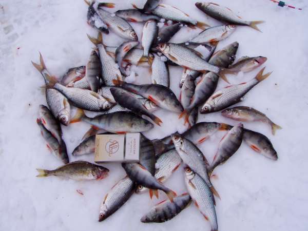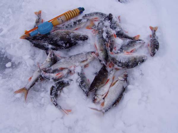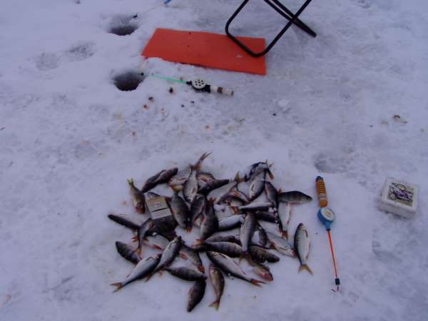 В воскресение, выйдя на лед в 9-15, при сильном тумане (видимость 100-150 метров), я пришел в УЖАС!!! В обозримом пространстве не было НИ ОДНОГО РЫБАКА (а вчера их эвон сколько было!!!). Поскольку из дома я уходил «по тихому», чтобы не разбудить внучек, то , естественно, не включал телек. Ну, думаю, или авария на дороге мощная, либо …. война…, ну быть того не может, чтобы народа не видно!!! Тем не менее, пришел, значит ловить надо! Начал с безмотылки, которая работала вчера – 0! С мотылем – 0!!! На удочки – 000! До 13-00 курил бамбук, потом потихоньку раскочегарил – улов на фото. НО!!! Рыба опять клевала очень осторожно, пустых подсечек – море! В который раз убедился, как важен свежий и ЖИВОЙ мотыль на крючке! Стоит рыбешке его «замочалить» даже при одной неверной поклевке – кури, пока не насадишь свежего, ШЕВЕЛИВШЕГОСЯ и сидящего на крючке тоже «крючком»!!! Да! К 11 часам туман разошелся и мне стало спокойней – я не один на льду!!! (фото). Резюме: в субботу работала безмотылка, а в воскресение удочка со сторожком. Почему стожок? C поплавком не видно миллиметровые колебания насадки, а с оным – запросто!