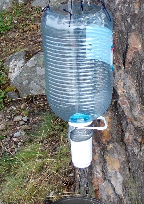 Привязываем фильтр к стволу дерева или вешаем на сучок. Наливаем воду.