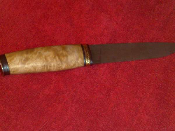 Нож делал для себя любимого.Сталь 154 СМ,заказывал на "ганзе".Нержавейка одна из лудших зарубежных марок.Закалка 58 ед,в криогене.Узор (не помню как он у буржуев называетсся, но прикольно) по всему пириметру рукояке. Накладки вулканическая фибра, и подук.Темляк-кожа, рог буйвола,бивень мамонта. Ну вроде и все! :ff: