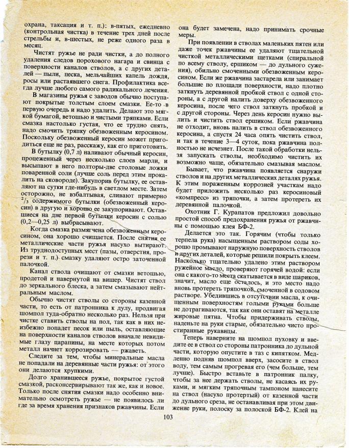 В вопросах по оружию я консервативен. Дерево на ружье пропитываю льняной олифой потом воском разведённым в бензине, чищу так как учили дед и отец. Более 50 лет патроны для всех своих ружей заряжаю сам, пыжи тоже сам и войлочные тоже сам вырубаю и осаливаю пушечным салом, древесностружечные не признаю особенно на ответственных охотах.Запасы жевело около 500шт. Ещё по цене 3 руб. за 100 шт. Дроби примерно 15 кг. Так, что на мой век ещё хватит и внуку останется.