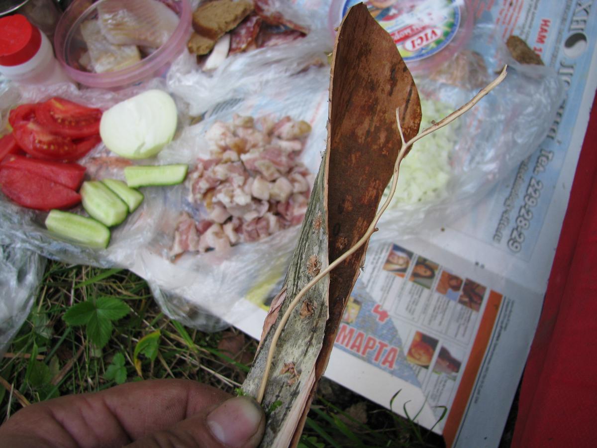Скрутил бересту,палочкой березовой защемил... Оказывается бересту выскабливают снаружи и так делают ложки