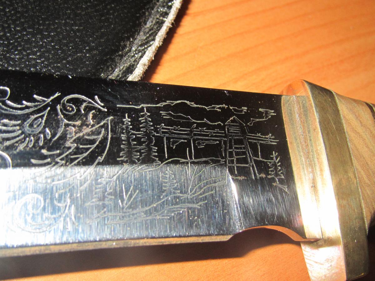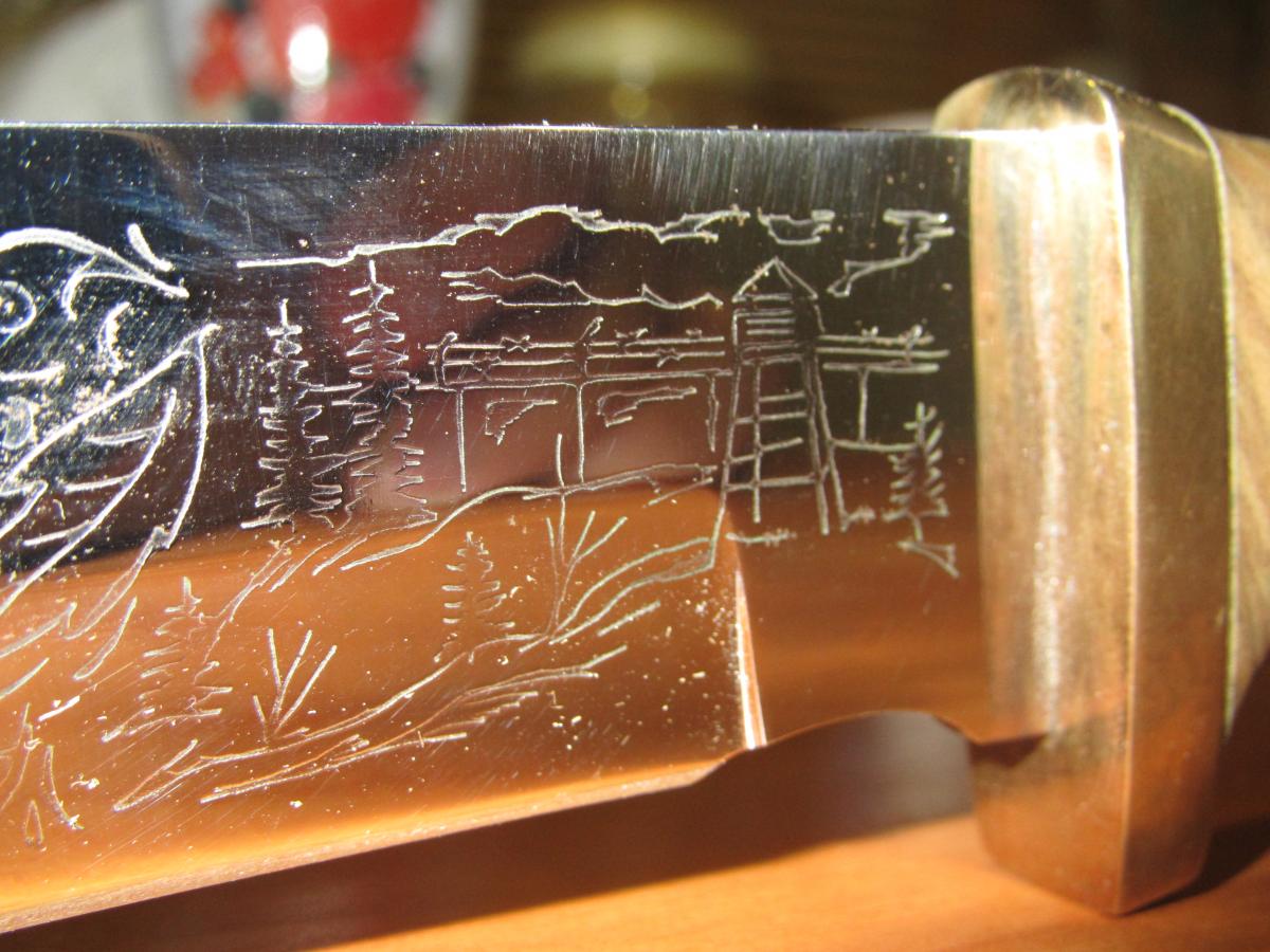 Или намного проще:Таки да. Нужен сварочник постоянник и железное ведро с солёной водой.Лезвие красится краской,особое внимание будущей режущей кромке.Чем-нибудь острым процарапывается рисунок.