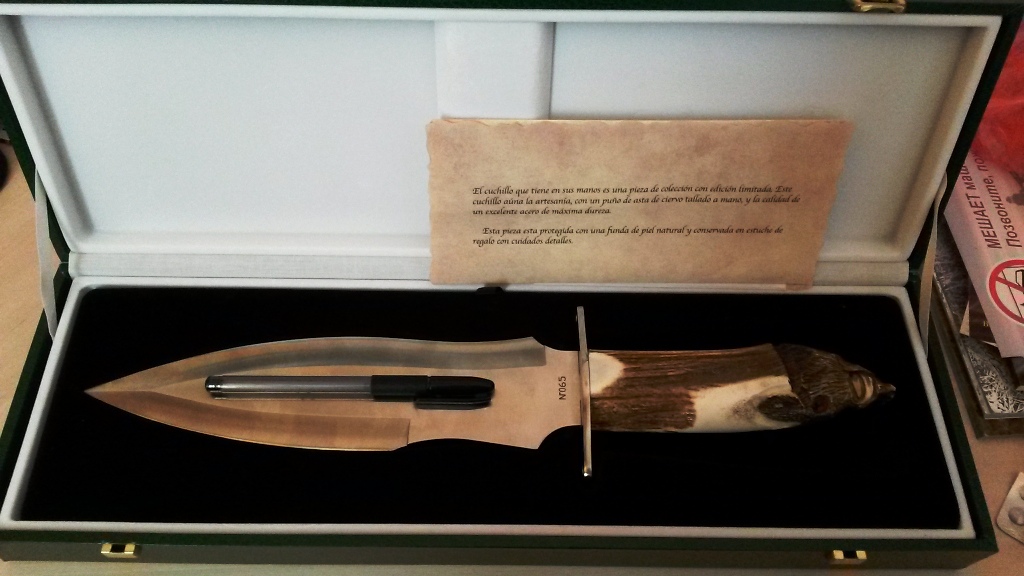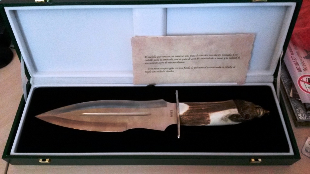 Сталь 440С, обоюдоострая заточка, длина клинка 260мм, ширина 65мм, толщина 5мм, общая длина 420мм, рукоять олений рог (удобная), Вес!!! 648 грамм. Произведено в Пуэрто де ла Круз на Тенерифе :) Сертификат, инвойс все честь по чести.