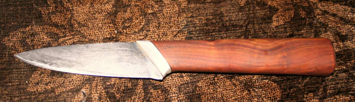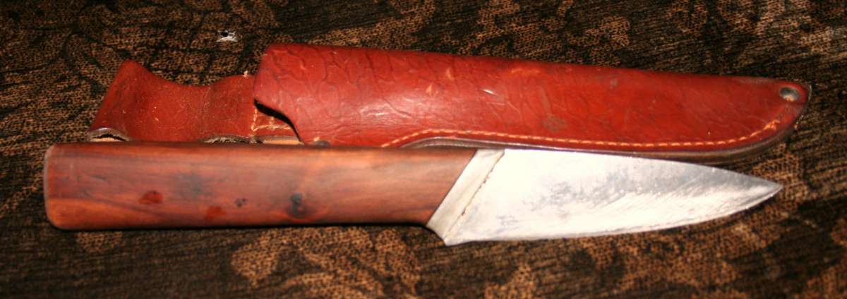 Любимый другой. Познакомился с охотоведом из кировской области. Увидел у него нож. Понравился. Срисовал контур. Сделал себе похожий, правда с некоторыми поправками. Удлинил рукоять, потому как сильно мараешь рукава, когда режешь диафрагму в лосиной грудине при коротком лезвии. С длинной ручкой-гораздо меньше. У ручки сделал плоский торец. У первоисточника конец рукояти был круглым. Удобно ударять ладонью при разделке грудных хрящей. Ножичек очень легкий, верткий, сбалансированный. Удобно лежит в руке при любом хвате. Прекрасный скинер. Надрано этим ножем дичи без счету. Не очень твердый. Но на лосишку хватает. Легко заправляется. Тот же крупный брусок, который по Сапсану скользит как по напильнику, хорошо берет этот материал. Сталь-тепловозный клапан. Если память не изменяет 40Х10 или 12. Но не уверен. Для лагеря не совсем удобен. Короткое лезвие. Неудобно рубить ветки.