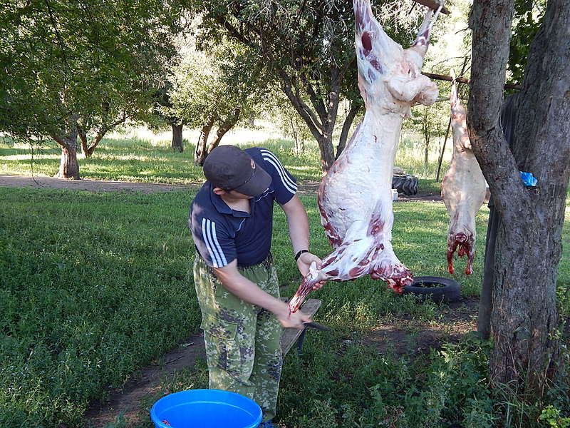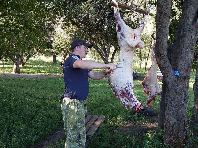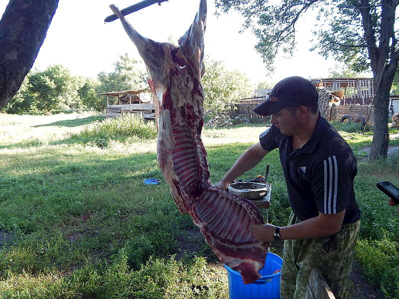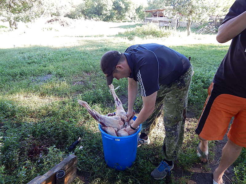 Топор в разделке пользую редко . Он мне нужен при разделки старых крупных копыт с закостеневшими хрящами. Мелочь-подсвинки, косули, домашнии мелкии скот- легко идет по суставам. В работе Бенчмейд из 440с. Много он видал от куниц до медведя.