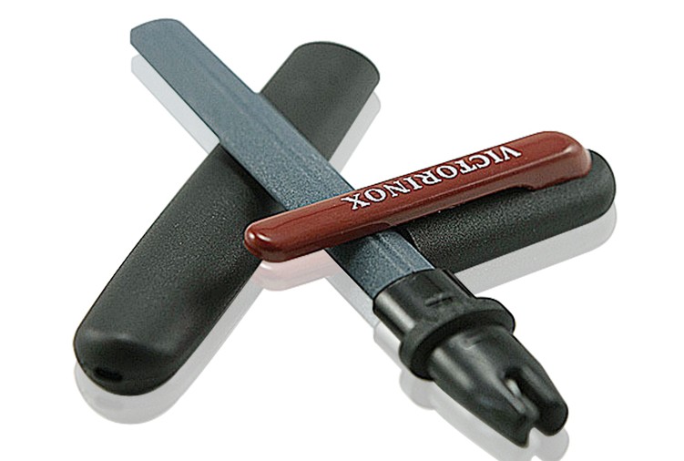 Таскаю с собой обычный малюсенький брусочек.. Но он мне не нравится. Видел у финнов что-то вроде алмазного надфиля - здорово работает!