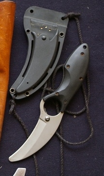 После того,как приятель,обрезая верёвку проткнул баллон у лодки,был куплен за 100рб вот такой нож,т.н.,"керамбит".Только кончик отпилен и закруглён,а резать верёвки с такой формой лезвия намного удобней.Да и в лодке отбросить не так опасно,это проще,чем пытаться нащупать ножны.