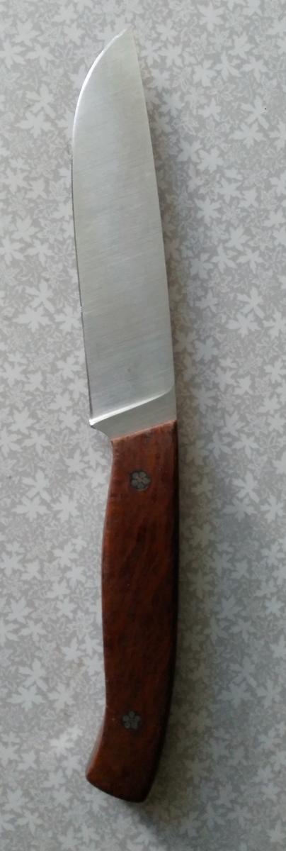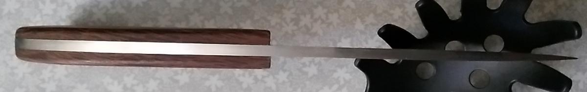 Проще. Нож делался не для кухни - на кухне он проходил первичные "испытания". Лук дома режу на доске, а вот на охоте-в поле - не всегда есть доска, и в поле у меня мало работы для ножа, поэтому после шинковки двух тазиков овощей - можно получить представление - удобен ли нож будет в поле.
