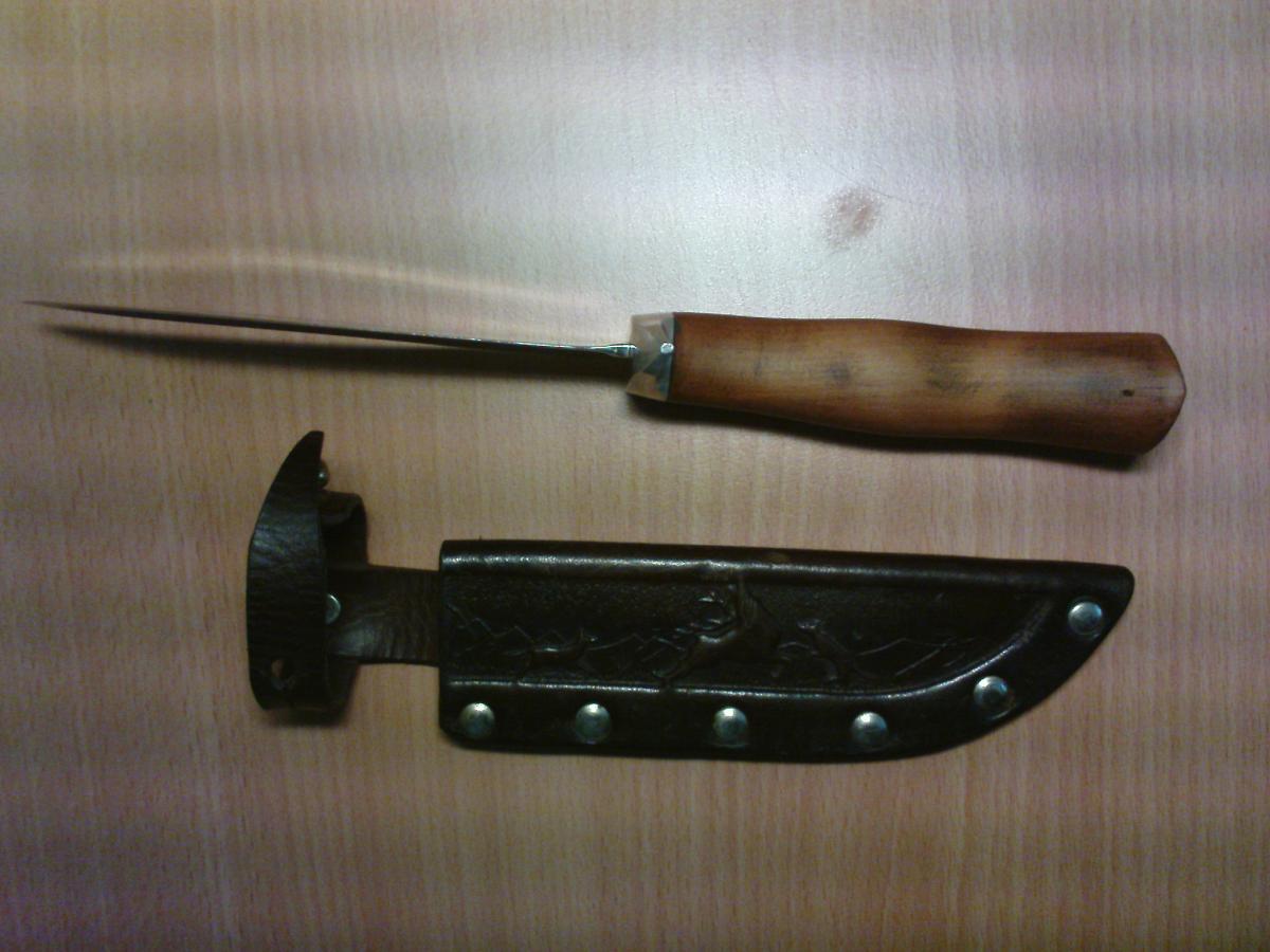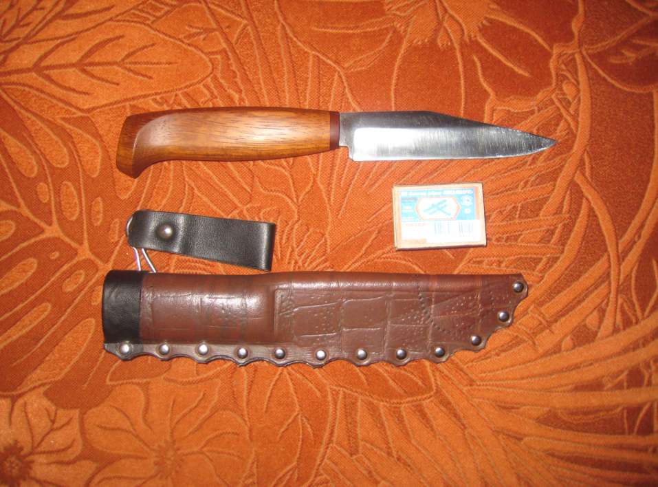 Мастер делал разные национальные ножи, но в основном финские. При случае спрошу у него, чем обусловлена такая форма лезвия. А чехлы у него все такие.