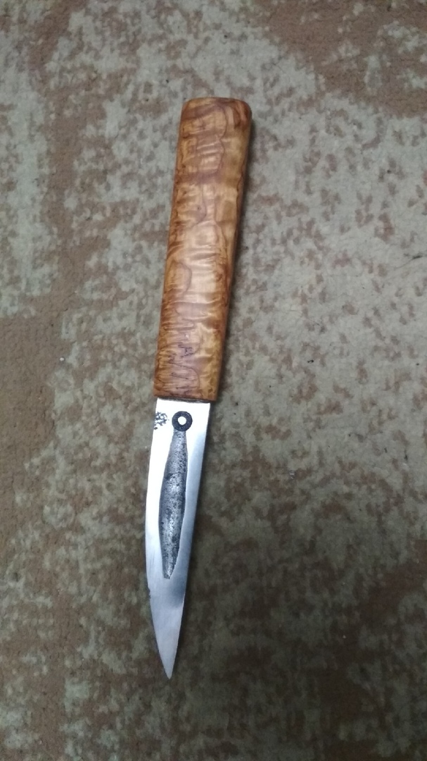 Приятный нож, люблю такие со спусками от обуха, и кабура оригинальная, у нас так не делают.После доводки, одел его в берёзовый кап