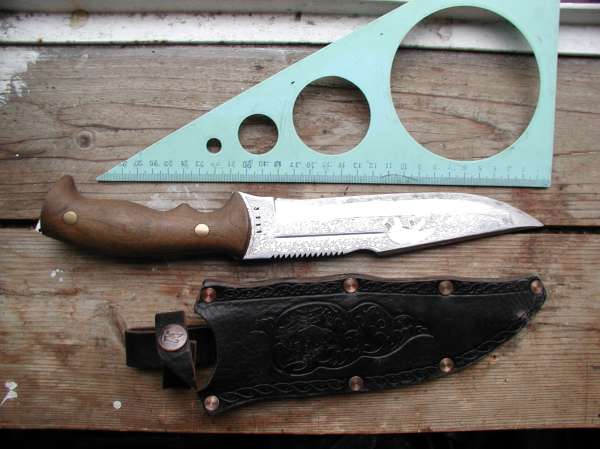6. НВУ Нож водолазный универсальный. Подарили. Гадость редкостная. Работать им нельзя, только резать всякую дрянь под водой и использовать как рычаг. Руки стирает в момент. Родные ножны выкинул, сделал свои из кирзы (кожи под рукой не было). Уже подарил товарищу.