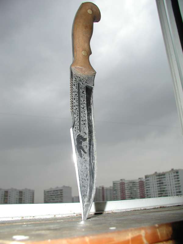 Носил на охоту несколько раз. Не плохо, но лёгкий клинок, плохо рубит ветки и жало слишком острое. Но в руке сидит отлично. Как только берёшь его в руку, сразу возникает желание кого-нибудь им под рёбра пырнуть. Не шучу. Это наверно на подсознательном уровне.