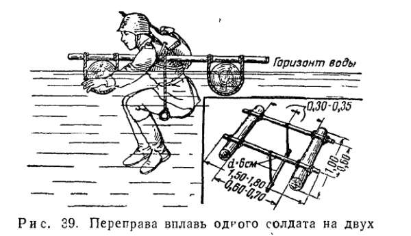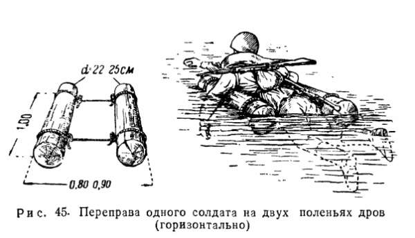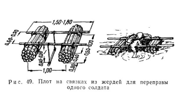 “Одна*ко некоторые типы плотов, проверенные в боевом применении в период Великой Отечественной войны, типичны Например, для переправы одного человека достаточен плот в форме равностороннего треуголь*ника со стороной 2,5—3 м из трех бревен диаметром 20—24 см той же длины.”