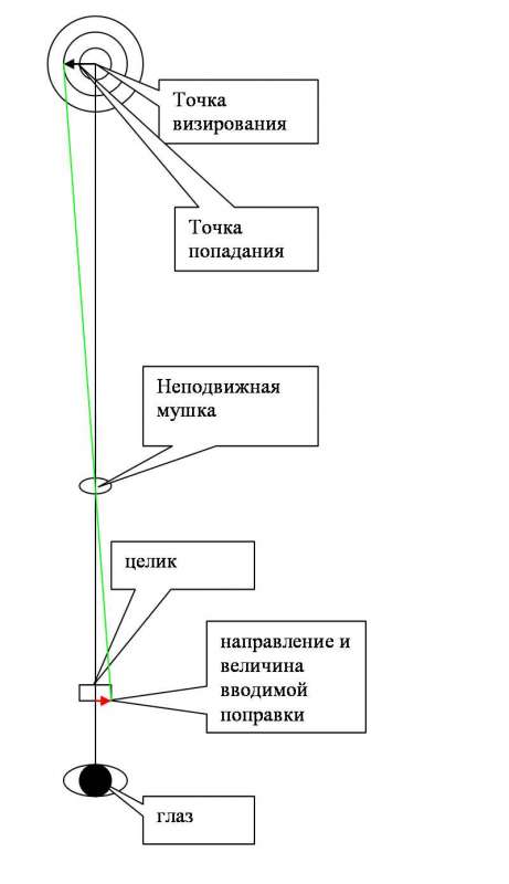 Может кто- нибудь разъяснить в цифрах, как это понимать. Например, если пуля попала в 15 см. от точки прицеливания на 3 часа?Как определить, на сколько нужно подвинуть мушку (вправо или влево), чтобы добиться относительно точного попадания? Приблизительно можно принять, что перемещение мушки должно быть во столько раз меньше горизонтального отклонения точки попадания отточки прицеливания, во сколько расстояние от глаза стрелка до мишени меньше, чем от мушки до мишени. Разумеется, начиная пристрелку, следует отметить рисками начальное положение мушки и целика.