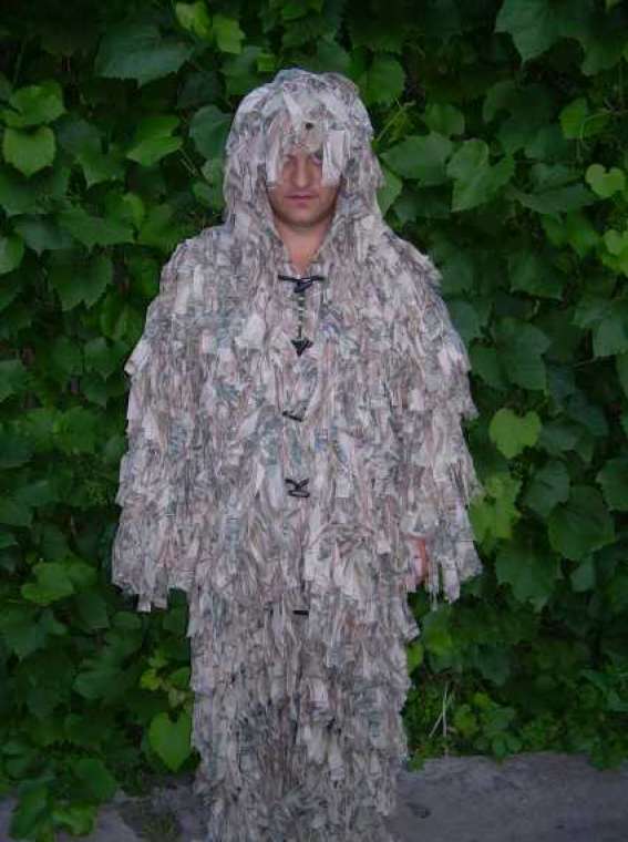 carelka (Наталья) ,вы молодец!Не важно,что эта тема уже была в чьём-то авторстве!Многие её читали,а вы её подняли и развили.Вспомнив вашу наработку,я прошедшим летом использовал эту идею.Была в сарае сетка маскировочная тёмно-зелёного цвета.Я вырезал кусок квадратной формы с дыркой по середине(классический вариант пончо)Сделал капюшон.Одел на себя и подрезал снизу лишку."Листья" на сетке очень мягкие и не коробятся.Хотел подкрасить коричневым лепестки частично,но краски не было ,и хорошо-надев на камуфляжный костюм,коричневый цвет с него и добавился.Вскидка ружья и доступ к патронташу очень удобный.Всё сделано на скорую руку,но потом я добавил мочало и джут,но не пришивая,а привязывая просто на удавку.Всегда можно добавить нужное количество "растительности".