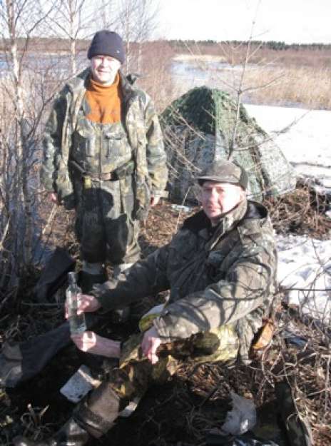 Все началось вполне прилично, за мной заехал СаГен и Аверс помогли загрузить вещи сами полезли в Патриот и СаГена осветило он так усердно собирался что забыл дома ружьё . Пришлось бежать домой за еще одним стволом. Вроде все нормально тронулись звонок от 13 он с пол четвертого стоит и ждет Фагота на Электросиле договорились их подождать при повороте в лес. Проехав до деревни К. вышли проветрится и у всех одновременно стоя под снегом с дождем родилась идея «А ну его на фиг в лесу ночевать» телефонный звонок решил судьбу этой ночи разворот на 180 и на полных парах к Паше Городничему на дачу. Паша встретил нас как полагается теплой печкой Водкой потом еще и еще тут и картошкой с тушёнкой . Постепенно подъехали Дикий Кот, Изотыч и Фагот с 13тым. Встреча продлилась часов до двух ночи. Рано утром 13тый звучным командным голосом оторвал всех от подушек и пошли по местам кто на болото утей гонять кто в поле на гуся сидеть. В поле выбрал Паша удачно между двух удачно вылитого с фермы навоза что привлекало дроздов но не гусей которые чихать хотели на нас и наши чучела и летали как товарные поезда в разных направлениях. После трех часов безуспешных ожиданий без воды и еды « а после вчерашней встречи пить то очень хотелось» решили ехать домой. На дачу постепенно стали прибывать бойцы. Результат большой ноль. Все надежды на вечер. Самые стойкие двинулись на вечернюю зорьку .и прибыл СаГен с селезнем. На стротегическом совете было принято решение довести вчерашнее дело до конца добраться до леса в поселке М. Старт назначен на два ночи. Немного поспав тронулись в путь. СаГен сдал зачет на джиповода доставив нас почти к месту тока а сам поехал с 13тым на поляну за вальдшнепами. Пробирались Я, Фагот, и Аверс по колено и выше в воде на мой островок в болоте где я обычно ночую у тока не без труда. Паводком смыло две переправы, вышли в острова оставили Фагота дав ему совет где тетерева токуют и как к ним подобраться с Вересом двинулись дальше к глухарям. Самое трудное нас ждало на подходе к току. Фонарь погашен, мелкий сосняк, дороги почти невидно. Ток нас встретил глухой стеной закрыв глаза выставив в перед руки прорвались на токовище. Дав указание Аверсу, и разделив ток на две части, я двинулся в его дальнюю часть. Простояв около часа в шуме ветра, никак не мог расслышать песни. Уже светает , а песни нет. И тут среди шума леса вроде послышался шипящий звук .Прислушался так и есть поет. Адреналин в крови. Послушав минут пятнадцать уловив тем начал сам себе считать и прыгать. Пройдя метров пятьдесят стал уже отчетливо слышать песню и началось глухариное танго. Метр за метром, минута за минутой, уже вижу где он сидит, еще шажок и вот он в 10 -15 метрах. Между нами только одна сосна. Прицеливаюсь жду точения ,сердце бешено бьется . Зашипел. Выстрел. Сидит. Рядом сорвалось штук пять глухарей. Мой сидит вроде не понял что в него стреляли. Жду еще минут 20 вроде распелся делаю еще пару шагов чтоб ветки меньше мешали выстрел и глухарь камнем в низ. ЕСТЬ!!! Фото у Фагота и СаГена