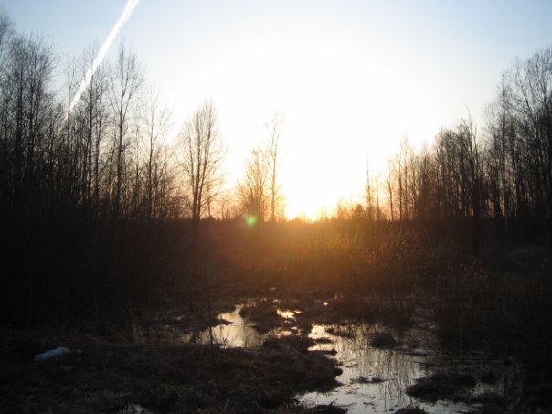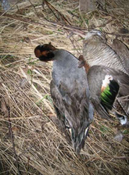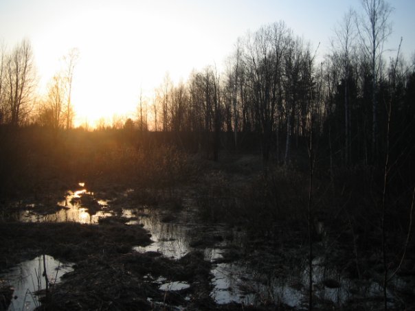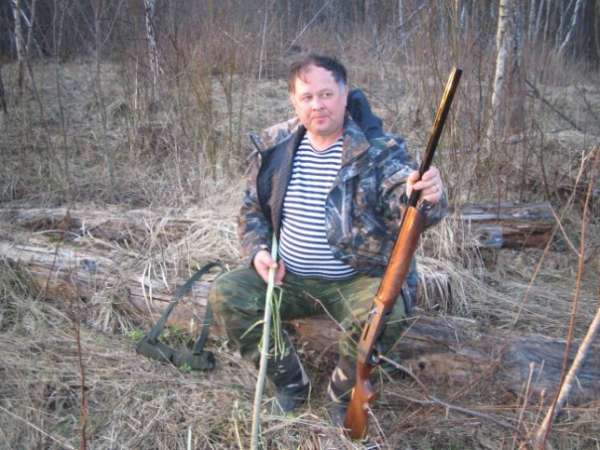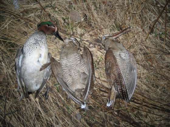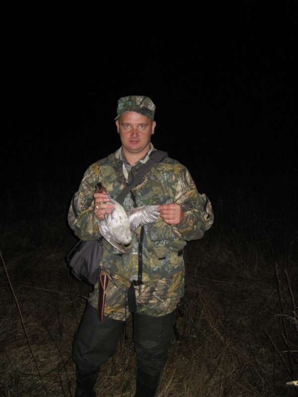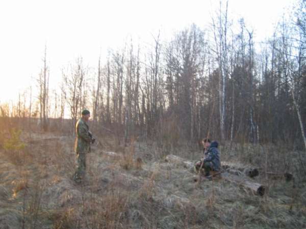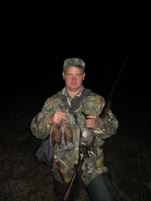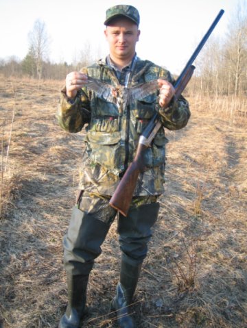 Классная вчера была погодка +22,думаю не пропадать же ей даром.Звоню Батяне и сотруднику по работе Андрею,предлагаю поехать поохотиться на местечко ,где на открытие были.Они конечно соглашаются,пошел выписал им путевки гостевые.Договорились выехать из Колпино в 18-00.Одел болотники , с собой взял чучела и манок на утку(уж очень хотелось утку добыть).Выехали.По дороге на место практически около каждой деревни видели на полях в лужах кучу уток и селезней(парами).Подъезжая к месту остановились напротив видневшегося через лесок в метрах 200 пруда,пошли обследовать.Дошел я один так как в болотниках был(вокруг пруда болото),на пруду лед -облом,пошел я уж выбираться обратно,вижу из леса на меня вальшнем вылетил,стреляю,сбил.Подхожу ,беру в руки,странно птица такая же как вальдшнеп один в один,только меньше гораздо,забираю и двигаемся к машине.Утки не одной не видел.Решили мы тронуться на свое место,может там повезет(на открытие над нами пролетало куча уток и два косяка гусей).Приехали ,разложились,место у нас удачное попалось (низинка с болотцем).Сидели ,наслаждались пением птиц,до 22-00(пусто).Началась тяга.Видели в этот вечер всего штук пять.Двоих сбил я,и Батяня одого.Мои удачно упали рядом(сразу нашел),а Батин спикировал в лес.Пока Батя и Андрей искали вальдшнепа,с их стороны смотрю на меня летят две утки,стреляю во вторую-сбил.От радости я чуть из штанов не выпрыгнул.На этом наши пострелушки закончились в 23-00,и мы отправились домой.