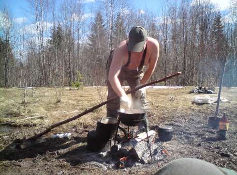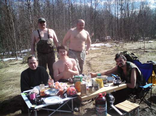 Первомайские с коллективом решили встречать в угодьях ПРООиРа. 30.04.около 20 часов я с jeri приехали к месту стоянки. Оставалось около 200 м до поляны по лесной дороги. Остановка, изучение дороги. Снег лежит,но рыхлый, над дорогой свисают пусты и ветки. Решено-чистим дорогу и едим. При помощи бензопилы очищаем проезд, по снегу проехали без затруднений. Наконец поляна. С Виктором разгружаем вещи, ставим стол, разжигаем костёр, между делом отмечаем приезд горячительным. К вечерней тяги лагерь готов. Вальдшнеп тянул фактически над нашим столом. У Виктора не было патронов с мелкой дробью, посему решил открыть фотоохоту. Сидим за столом пролетает очередной вальдшнеп, Виктор меня опережает и пытается взять на прицел в фотообъектив, но не тут-то было, вскидываю свою ТОЗовку, выстрел. Валя падает. Бежим искать , да не тут-то было,примерно через 5 мин поиска в 20 м валя приходит в себя и улетает. Всё понятно Была кратковременная контузия, т.к. стрелял я большого расстояния до цели. Ну и ладно, садимся за стол, продолжаем наши беседы. Через непродолжительное время слышится хорканье, время тёмное, над лесом вижу очередного вальдшнепа пикирующего к земле. На фоне леса я его не вижу и вдруг в 10 м от меня и 5 м от а/м валя сел на землю, вижу только силуэт. Не вставая со стула, разворачиваюсь и пытаюсь взять на мушку силуэт, но мушки не вижу, стреляю интуитивно, птиц улетает и скрывается в темноте- промазал. Примерно через 30 мин. Приезжает первый экипаж-Влад и Zhu на пассаде. К этому времени похолодело и образовался на снегу наст. Дима попытался проехать да не тут-то было. Решили оставить а/м. С Виктором помогаем ребятам перенести вещи в лагерь. Возвращаясь обратно к а/м на дороги Влад находит вальдшнепа и высказывает недовольство, как мне показалось мол чего дичью разбрасываетесь. Я в непонятках откуда он взялся и только потом понимаю, это тот который на землю сел, видно интуиция меня не подвели, а наблюдательность хромает. Вот так прошёл первый день заезда. Чуть позже к нам подтянулся и второй экипаж. Городничий с другом Александром и Volhv, радужная встреча, посиделки. Утром на тетеревиный ток благо он примерно в 400-500 м от лагеря. С тетеревом не получилось. Подманил я двух, и всё шло хорошо, но опять но, с правой стороны слышу движения, кто подходил я так и не узнал. Тетерева срываются и улетают, кто-то делает 2 выстрела, но мимо. Решено возвращаться в лагерь. По пути решил ещё поманить, получилось, через короткое время вижу тетерева, началось ожидания. Я чуфыркаю, тетерев отзывается, ходит по земле токует, красота. Стрелять не решаюсь, т.к. расстояние не подходящее, ещё и мелкие ёлки и сосенки мешают. Ожидания мои были напрасными, один из наших, возвращаясь в лагерь спугивает тетерева. М у и ладно думаю про себя, будут ещё впереди утренние.Возвращаемся в лагерь, обмен впечатлениями. Ну а дальше не большое застолье и сон. Просыпаемся части коллектива нет. Остался я , Виктор и Всеволод. Куда подевались остальные никто не знает. Машин их нет, а вещи в лагере. Втроем решено приготовить плов, с чем мы справились на все 100%, под чутким контролем Виктора. Через некоторое время подтягивается коллектив, оказывается они ездили в карьеры на селезня. Труды их были не напрасны, что-то добыли дальше могу путаться в хронологии. Приехал S_Astap..... Застолье, байки .... . План охоты на последующие дни. Решено в