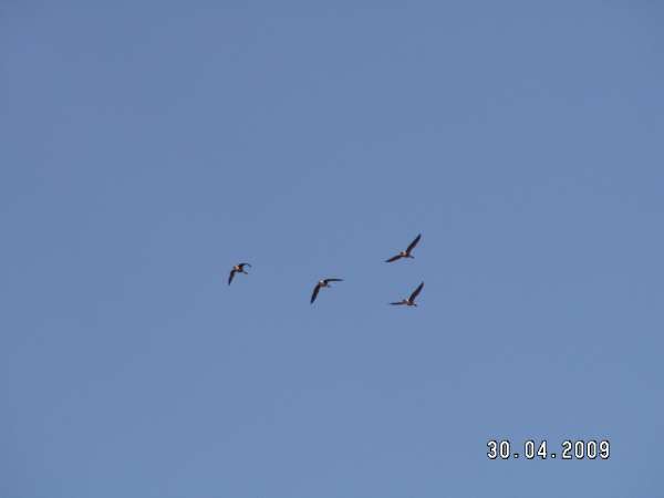 Приехали 30-го в обед на место и принялись за работу. Поставили лагерь, смотались за путевками, оборудовали засидки, расставили профиля... Незаметно настал вечер и тут началось! Т.е. не началось а НАЧАЛОСЬ!!!! Гусь летел просто табунищами, несколько раз на нас налетал черный горизонт!!! До этого видал такое только в зоне покоя. А тут - на полях, где можно охотится!!! Летела масса гуся, еще туча сидела на поле с профилями!!! Мы были просто в шоке! Надо отдать должное окружающим охотникам - до 00-01 первого мая никто не стрелял. Все терпели. И наслаждались зрелищем.