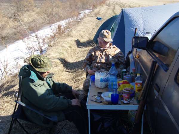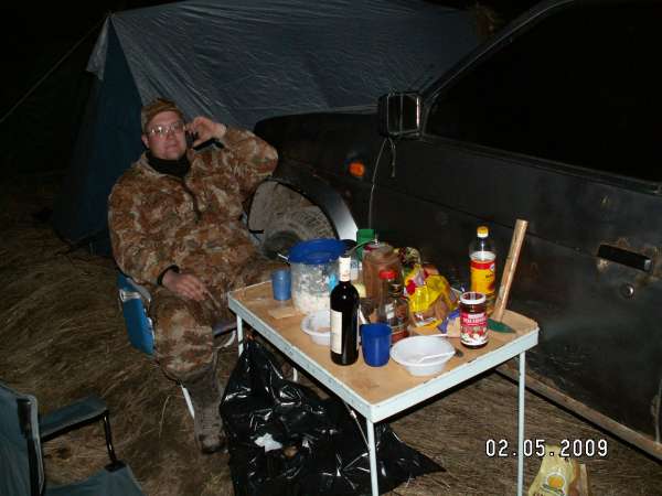 Итог за утро - 7 гусей и один селезень на двоих. Часам к 9 лет закончился, и довольные мы пошли к лагерю кушать и праздновать. И праздник удался! Соседского подранка удачно поменяли у них на хлеб (который второпях забыли купить =) и сели за стол - праздник же!!! =)