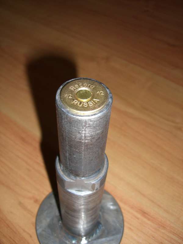 Фото 2: Так собирается и вставляется не калиброванная гильза с пробитым капсюлем. Хороший удар и гильза сжимая юбку входит внутрь калибровочной гайки заподлицо, не сплющивая кант.